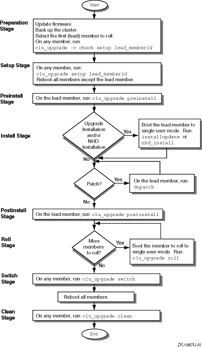 For more detailed information about using the rolling upgrade process to install a new operating system or TruCluster software version, see the Version 5.1 or higher Cluster Installation manual.