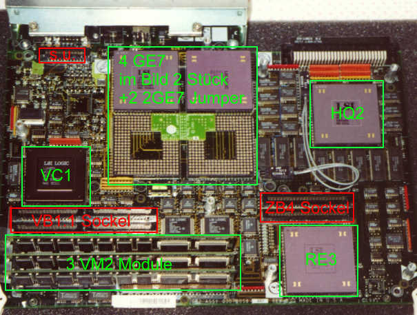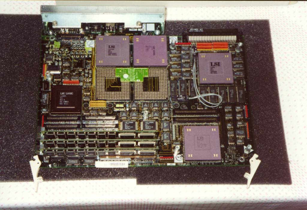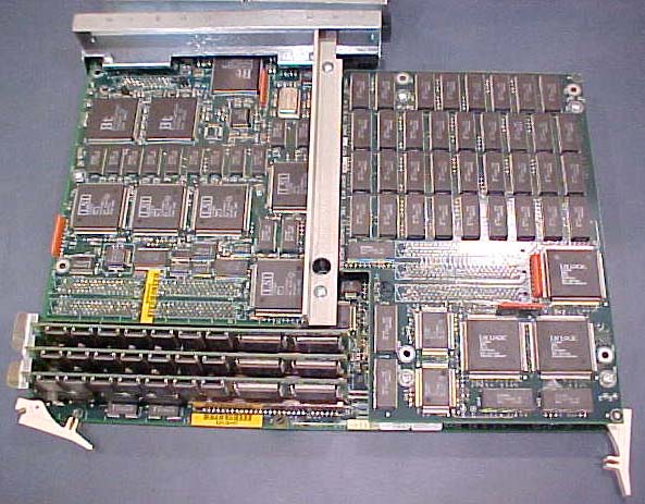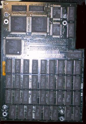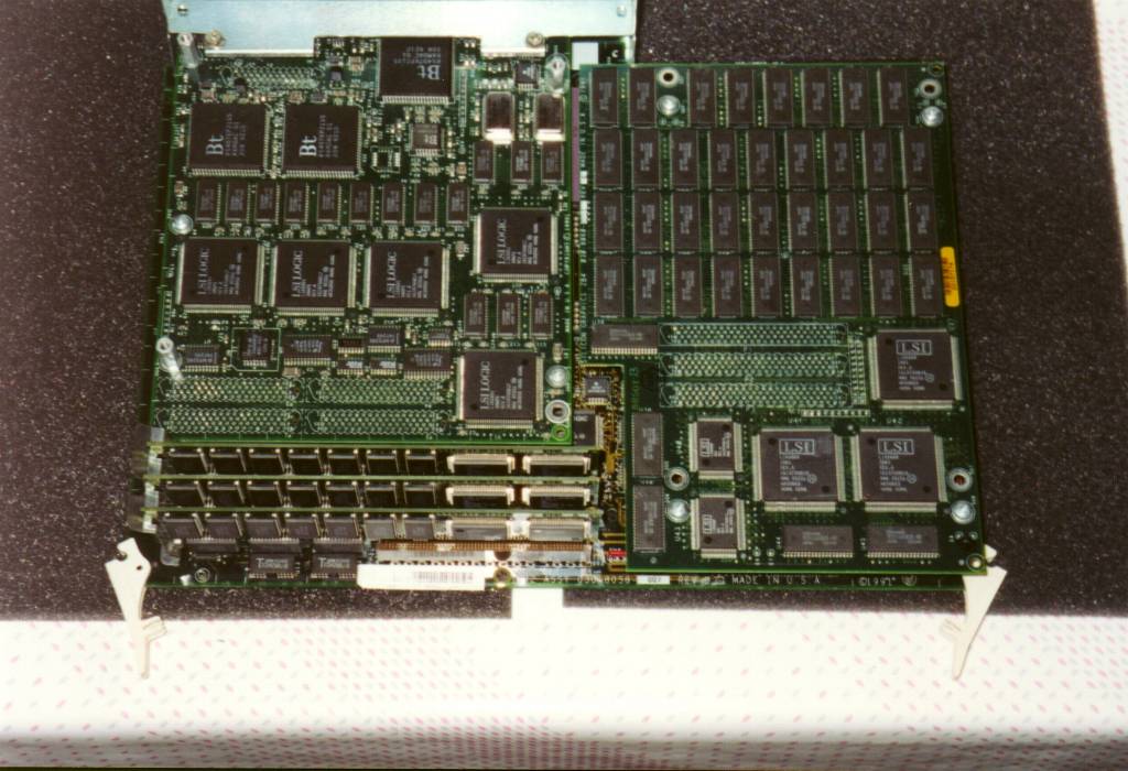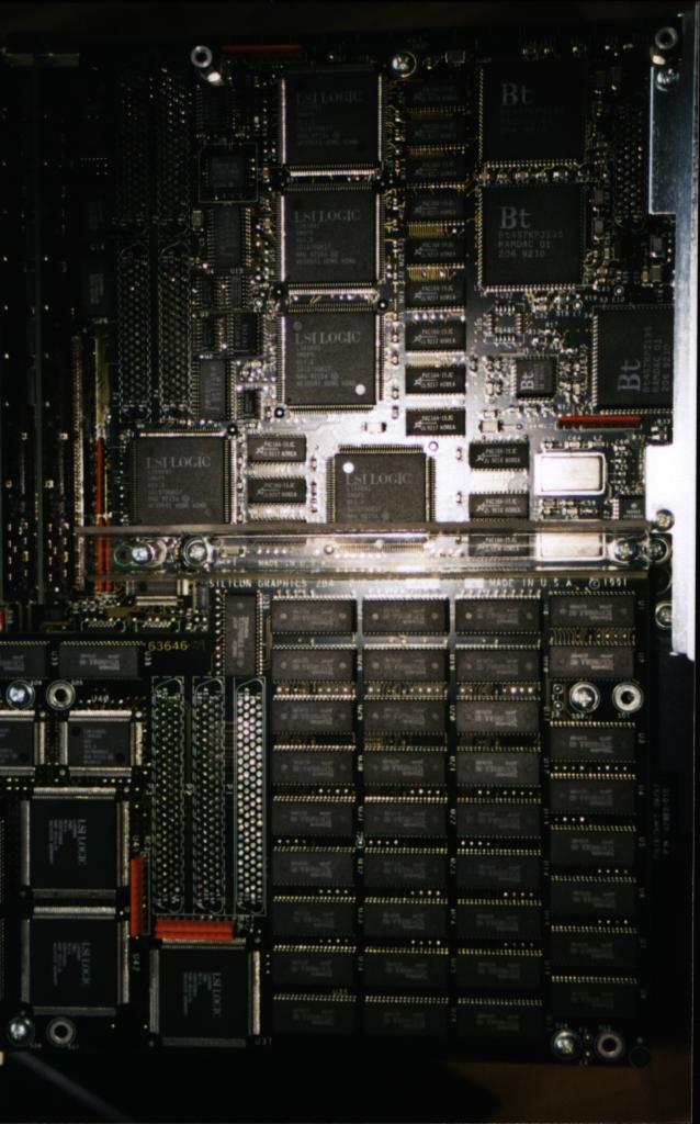 ![]() | Front shot of an Elan board set Left top: Z-Buffer board Three upright SIMMS: VM1 Framebuffer memory modules Right top: Image generator board (CMAP, RAMDAC, etc) |