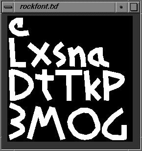 The font is specific to SGI X servers, so don't expect to find the sorority font on non-SGI X servers. The -fn option names the X font to capture. The -file option says what filename to save the .txf file as. The -glist option lists all the glyphs you want captured (you can duplicate characters on the lists; be sure to include space). The -bitmap option says to save in the compact bitmap format (instead of -byte). The -w and -h options specify the width and height of the texture image. The -gap option specifies the gap in texels between each glyph in the texture image.