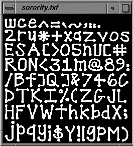 You'll want a few TXF texture font files. I'll supply a few .txf files that you can download: rockfont.txf, curlfont.txf, default.txf, haeberli.txf and sorority.txf (be sure to download these to a file; you can't view them with your browser; use Shift-LeftClick in Netscape to download). Each font is just over 8 kilobytes. Below is what the sorority.txf font (designed by Paul Haeberli of SGI) looks like: