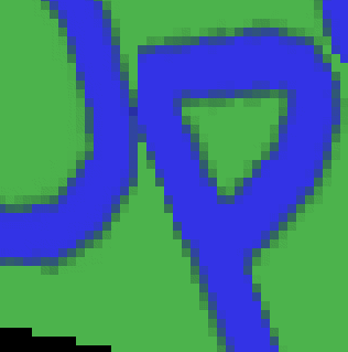We can actually do a little better than that. We can use alpha blending to actually blend the texels in with the underlying surface (the green cube). But the alpha component in the texture was 1.0 for the foreground of each character? Why would we want to blend then when basic blending with an alpha of 1.0 is just a replace? Well, if we use improved texture filtering (say GL_LINEAR or better), the texture filtering will give us alpha values between 1.0 and 0.0 so blending makes sense. Let's see a magnified view of the scene with high-quality texture filtering and alpha blending enabled:
