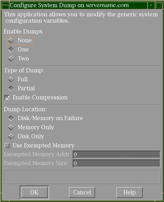 This chapter describes how you configure and generate system crash dumps and how you save and store crash dumps and their associated data using either the Graphical User Interface or manually. Crash dumps are a snapshot of the running kernel, taken automatically when the system shuts down unexpectedly. Crash dumps are referenced most often when you contact your technical support representatives to analyze and correct problems that result in a system crash. However, if you are an experienced system administrator or developer you may be familiar with techniques of crash dump analysis and you may want to take and analyze your own dump files.
