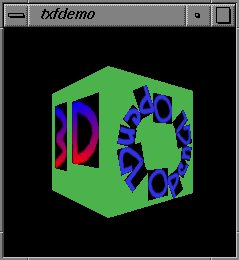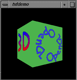 The program shown above is txfdemo.c; a simpler TXF program showing rotating text is simpletxf.c. The program to show the complete glyph set texture image for a .txf file is showtxf.c. Check out the source code.