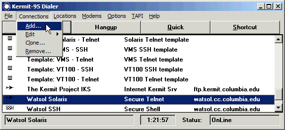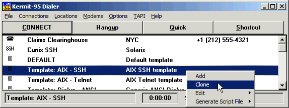 The Dialer comes with several entries preloaded, plus a selection of Templates you can use to quickly "clone" new entries of your own, e.g. an SSH connection to Linux, a Telnet connection to Solaris, a dialup connection to a BBS. Each connection is represented by a line in the main (white) window consisting of a little icon, a name, a location, and a phone number or network address. The entries are listed alphabetically by name.