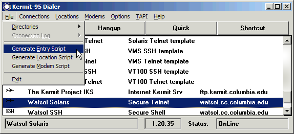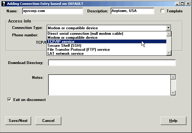If you have a telephone and modem, you can make and use dialup entries. If you have a TCP/IP network connection (either a direct connection to an Ethernet or other type of Local Area Network, a DSL connection, or Dial Up Networking), you can make and use network entries: SSH, secure Telnet, regular Telnet, secure FTP, regular FTP, and others.