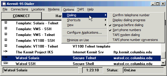 Remember, you don't have to use the Dialer if you don't want to. It is a convenience, not a necessity. Every Dialer dialog, checkbox, and radio button has regular Kermit commands lurking behind it, as documented in the C-Kermit book, supplements, and this manual.