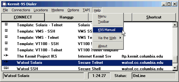 If you have an Internet connection, you can use the preloaded Kermit Project entry right away, even before you know how K-95 works. To make a connection, just double-click on the entry, or highlight it with a single click and then click on the [CONNECT] button. What you get in this case is an "IKSD>" prompt of Columbia University's Internet Kermit Service Daemon, which is really just C-Kermit in a new guise. If you know how to use C-Kermit, feel free to give it a spin. If you don't know what to do, type HELP to get started, or type EXIT to get out. If you notice a certain similarity between IKSD and the K95 Command window, it's no accident.