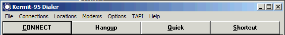 Kermit 95 comes in two pieces: a graphical Dialer (K95DIAL.EXE) and a text-based command and communications engine (K95.EXE). The Dialer is a user-friendly "front end" for K95 in the normal Windows graphical style, complete with menus, toolbar, and numerous graphical dialogs. You can use the Dialer to define all your connections, and after that you can access them any time you want simply by clicking on them. But you don't have to use the Dialer at all if you prefer not to, which might be the case if you are already an experienced user of C-Kermit or MS-DOS Kermit.