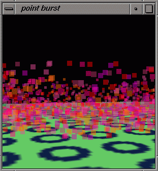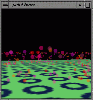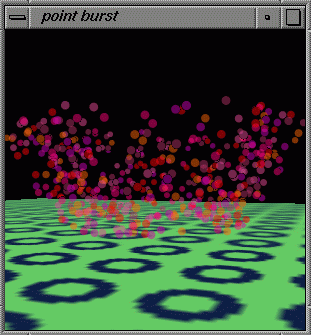 The system itself is a bunch of particles that explode from a central point outward. The particles have a random velocity, angle of direction, and angle of trajectory. The particles bounce off the ground surface provided. This is a really simple particle system. You could be much much fancier. Consider cool effects like using a 1D or 2D texture to add color variations. OpenGL's texture coordinate facility can be used in clever ways. You can also combine these particle effects with fog for distance attenuation of color. A filtering blend can be used to create effects to simulate filtering effects due to gases or smoke.