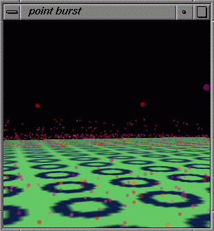 The screen snapshots below show views of a particle system rendered as OpenGL points. The SGIS_point_parameters extension (supported by SGI's InfiniteReality) is used to attenuate point size based on eye distance. The program works fine without the extension, but the points are not eye distance attenuated.