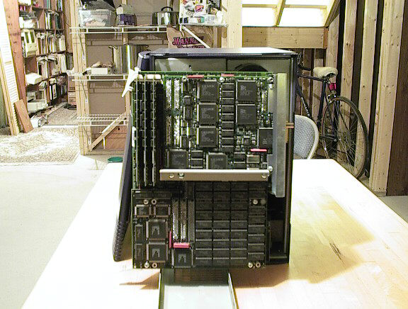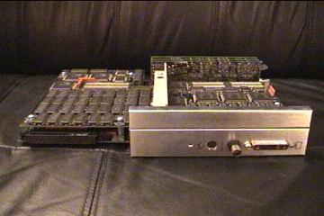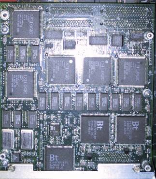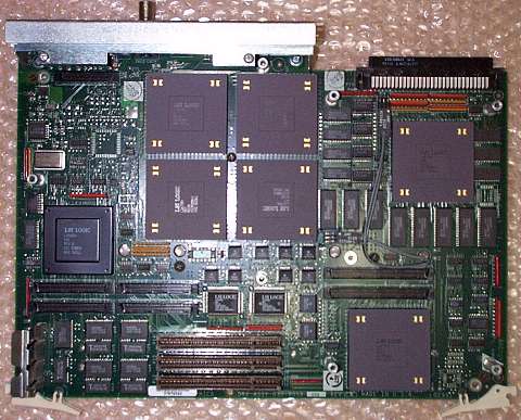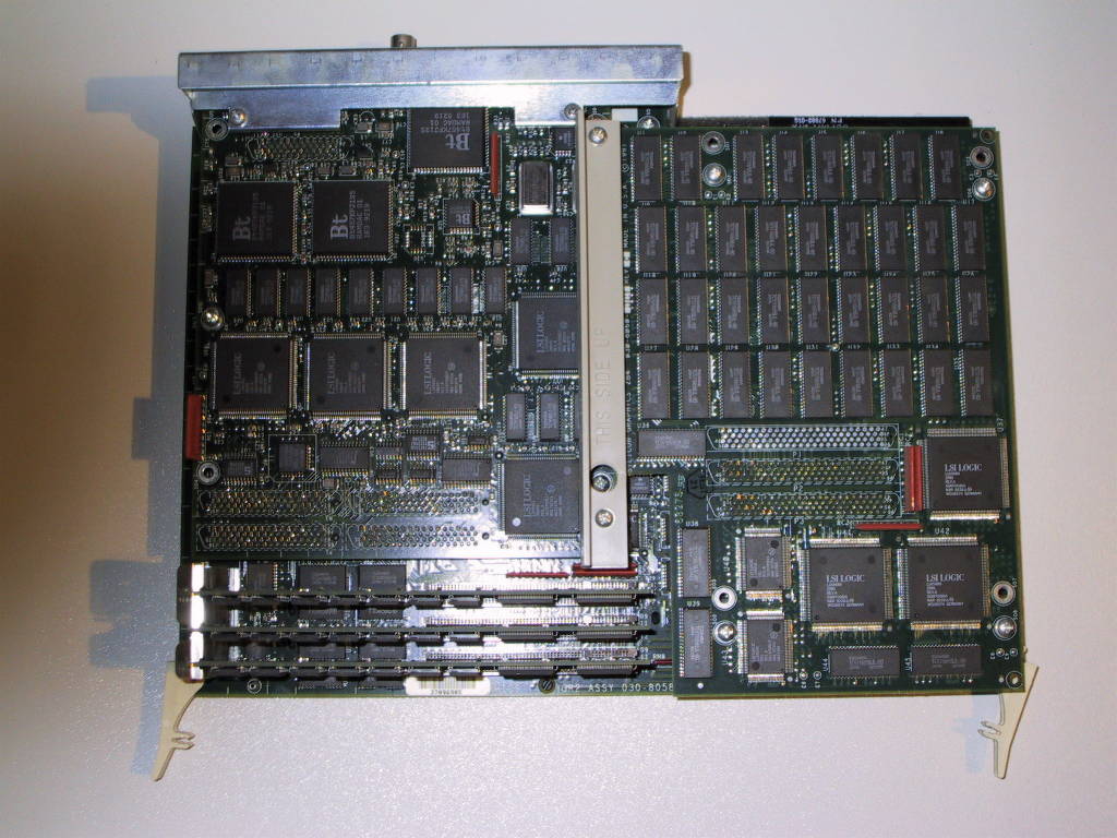 ![]() | Front shot of an Elan board set Left top: Z-Buffer board Three upright SIMMS: VM1 Framebuffer memory modules Right top: Image generator board (CMAP, RAMDAC, etc) |