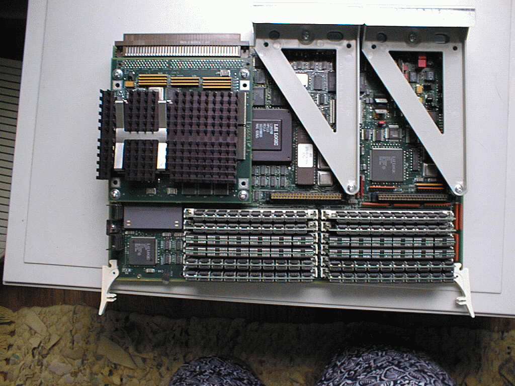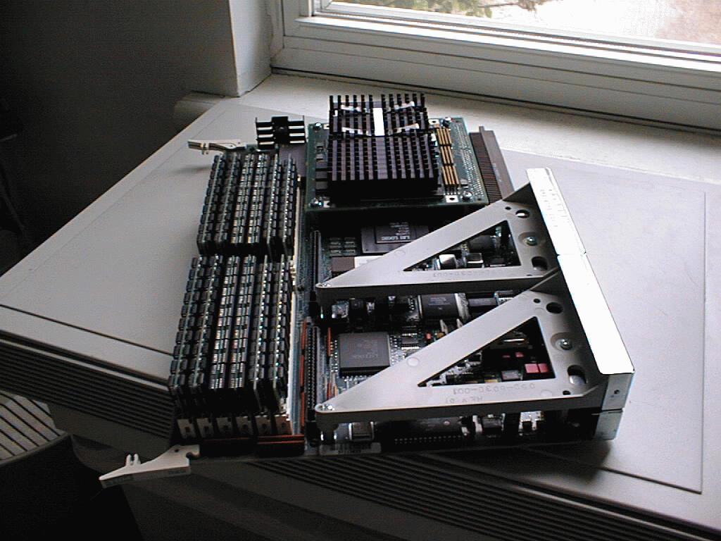 ). The Indigo 2 and Indy using a similar board, the differences are only the expansion port (GIO64) and the backplane (EISA) as well as the form factor. The IP20 takes standard 72 pin PS/2 Simms with true parity. The Simms are labelled S1A-S4A, S1B-S4B and S1C-S4C. It can hold up to 384MB of memory. Since the Processor is on an own modules, it is upgradable. There are three different processor modules (PM). The standard configuration was the R4000 with 100MHz (PM1). Later SGI made an upgrade offer with a R4400/150MHz (PM2) (