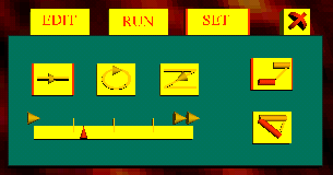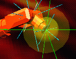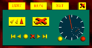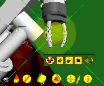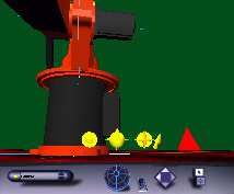 Other InteractionsUse the Browser control elements to navigate through the world. The default EXAMINE-Mode works best here. There are some predefined viewpoints, a special one is the camera-viewpoint (picture at the left) which simulates a camera mounted at the end of the robot arm. Hand is another moving viewpoint which always follows the motion of the tool keeping the TCP in your focus. (Note: In the WinNT/9x Version trajectories won't interpolate smoothly when you have chosen one of these viewpoints.)
