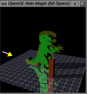 Notice that the dinosaur model is not very convex and the halo does not evenly surround the object. You can improve the halo effect in these cases by haloing the different pieces that make up the dinosaur with distinct scaling. For example, halo the head, then each arm, then each leg, then the main body. The example adds texture to the floor. Notice you still see through the halo to see the textured floor surface as you would expect. Also notice that the post is in front of the halo so it does not get blended with the halo (unlike the previous image where the post was behind the halo).