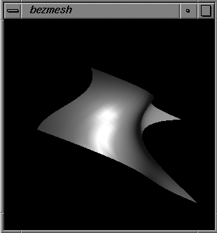 Below is a Bezier surface rendered with OpenGL evaluators. Notice that lighting is enabled and uses surface normals generated during the evaluation. The source code for the program is bezmesh.c.
