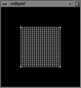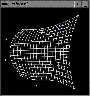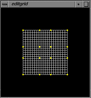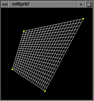 The first picture above shows a basic 2D grid. The yellow dots indicate the location of evaluator control points. editgrid allows the user to interactively move the control points and see the corresponding change to the grid. The second picture above shows that the control points really are the corners of the grid. The grid above is specified as a 2nd order evaluator mesh for both U and V; this is why the grid is so linear.