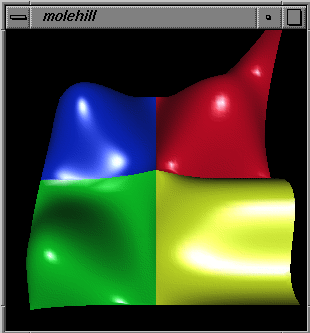 While curves and surfaces generated by evaluating Bezier patches and curves are interesting, surfaces defined by NURBS (non-uniform rational B-splines) are very common in 3D modeling and CAD. OpenGL's GLU library contains utility routines that will render NURBS surfaces, automatically making use of evaluators where possible to speed the rendering. Below is an example of rendering NURBS. The source code for the program is molehill.c.