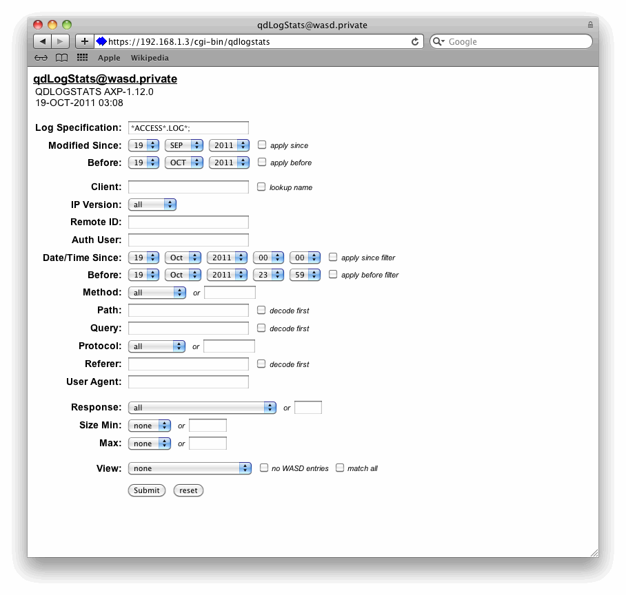 A number of filters allow subsets of the log contents to be selected. These filters support the same string matching expressions as the server (see "WASD VMS Web Services - Install and Config"; 6 - String Matching).