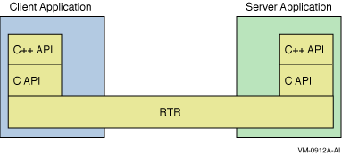 Client applications and server applications can use both the C++ API and the C API or just the C++ API. The C++ API maps RTR data elements, data structures, and C API functionality into the object-oriented design world.