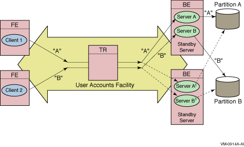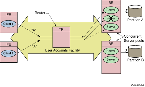 For example, Figure 2-1 illustrates the use of concurrent servers to process transactions for Partition A. When one of the concurrent servers cannot service transactions going to partition A, another concurrent server (shown by the dashed line) processes the transaction. Failover to the concurrent server is transparent to the application and the user.