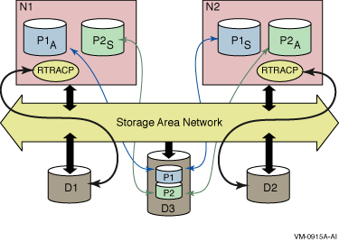 Take the case of the configuration shown in Figure 2-3. Assume that P1A (active server process for partition 1) has crashed on node N1. RTR will attempt to fail over to P1S. Before P1S can be given new transactions to process, it has to resolve any in-doubt transactions that are in N1's journal sitting on D1. Therefore RTR on N2 scans the journal of N1 looking for any in-doubt transactions. If it finds any, these are reissued to the P1S. Once transaction recovery is completed, P1S then changes state to active and becomes the new P1A. In this case, since the RTR ACP is still alive, and since it is the RTR ACP on N1 that owns the journal on D1, RTR on N2 will do a journal scan using the RTR ACP on N1. This behavior is the same for both recognized and unrecognized clusters.