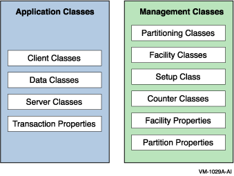 Figure 1-1 shows the C++ foundation classes. Management classes represent RTR, facilities, partitions, and key segments (part of the partitioning classes in Figure 1-1 whereas application classes represent transactions, data, messages and events.