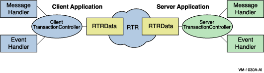 Figure 1-2 illustrates the client and server classes and the paths through which they typically communicate. (There are design alternatives to the illustrated path.) TransactionController objects control transactions. Communication between client and server applications is through messages and events sent and received by the RTR application. Data objects (instances of data classes) carry these messages and events between RTR clients and servers.