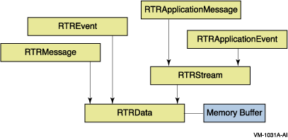 Figure 1-3 illustrates the data classes and their relationships to the RTRData base class and a memory buffer. For example, the base class of RTRStream is RTRData and the base class of RTRApplicationMessage is RTRStream.