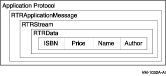 RTR applications need to define an application-level protocol to pass data between client and server. From the point of view of a client or server application, the application protocol is just data. The data object encapsulates the application protocol as shown in Figure 1-4. In this example, a protocol is defined for sending data between a client and server application that processes book orders, as in the book ordering sample application. This data protocol includes fields for ISBN number, book-price, book-name, and author. These fields are contained in a buffer in an RTRData object.