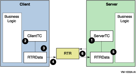 Figure 1-5 illustrates client/server deployment and interaction. The numbered steps represent client logic within the client application and server logic within the server application. For a more detailed description of transactional messaging, see the RTR Application Design Guide.