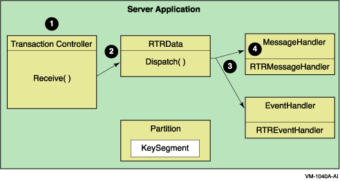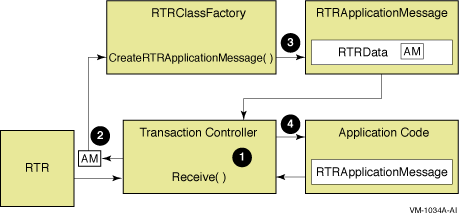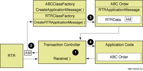 When the application calls Receive, the transaction controller determines what kind of message or event is about to be received, and then calls the appropriate method in the application-derived and registered class factory object (for example, CreateRTRMessage). This method creates the appropriate data object (for example, an RTRMessage object) and returns it to the transaction controller. The transaction controller copies the incoming data into the data object returned from the class factory and returns back to the application's call to Receive().
