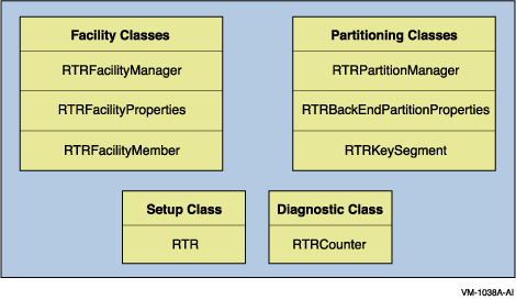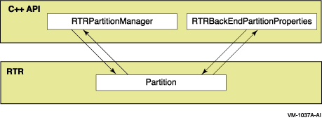 Figure 1-9 illustrates the relationship between RTR entities and partition classes. Partition classes refer to an RTR partition. As the figure illustrates, the actual partition resides in RTR, not in the foundation class objects. Methods within the partition classes can create and delete partitions, and get partition properties for the RTR partitions.