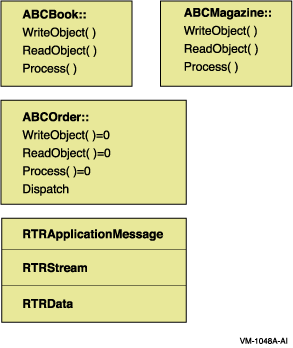 For example, a book is represented as an ABCBook object with its inherited Dispatch method from ABCOrder. This class overrides the WriteObject, ReadObject, and Process methods. A magazine is represented as an ABCMagazine object with overridden WriteObject ReadObject, and Process methods, and the Dispatch method inherited from ABCOrder.