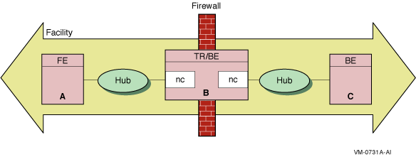 | RTR> CREATE FACILITY A /Router=B /Backend=C | The backend, node C. |