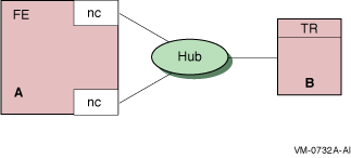 In Figure 2-3, Node A is a frontend, Node B, with the two network cards (nc), is both a router and a backend, and Node C is a backend. The hubs are Ethernet hubs. Figure 2-4 illustrates a frontend with two network cards.