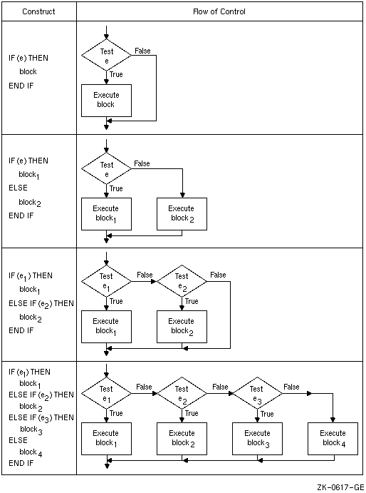 Depending on the evaluation of the logical expression, one block or no block is executed. The logical expressions are evaluated in the order in which they appear, until a true value is found or an ELSE or END IF statement is encountered.