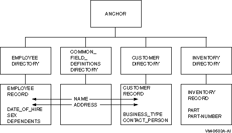 Figure 8-2 shows a nonhierarchical repository structure. In this example, fields NAME and ADDRESS are used by both the EMPLOYEE-RECORD and the CUSTOMER-RECORD. As such, they are defined in a separate directory (COMMON_FIELD_DEFINITIONS). The fields PART and PART_NUMBER are used exclusively by the INVENTORY_RECORD. As such, they are defined in the INVENTORY directory. This functionality is only available in CDO formatted repositories.