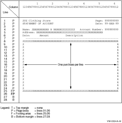 In Figure 10-7, each detail line of the report represents a separate purchase at the XYZ Clothing Store. Each page can contain from 1 to 18 purchase lines. Each customer can have an unlimited number of purchases. A total of purchases for each customer is to appear on line 25 of that customer's last statement page. Headers appear on the top of each page.