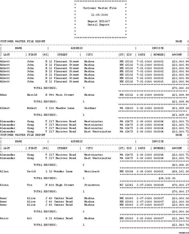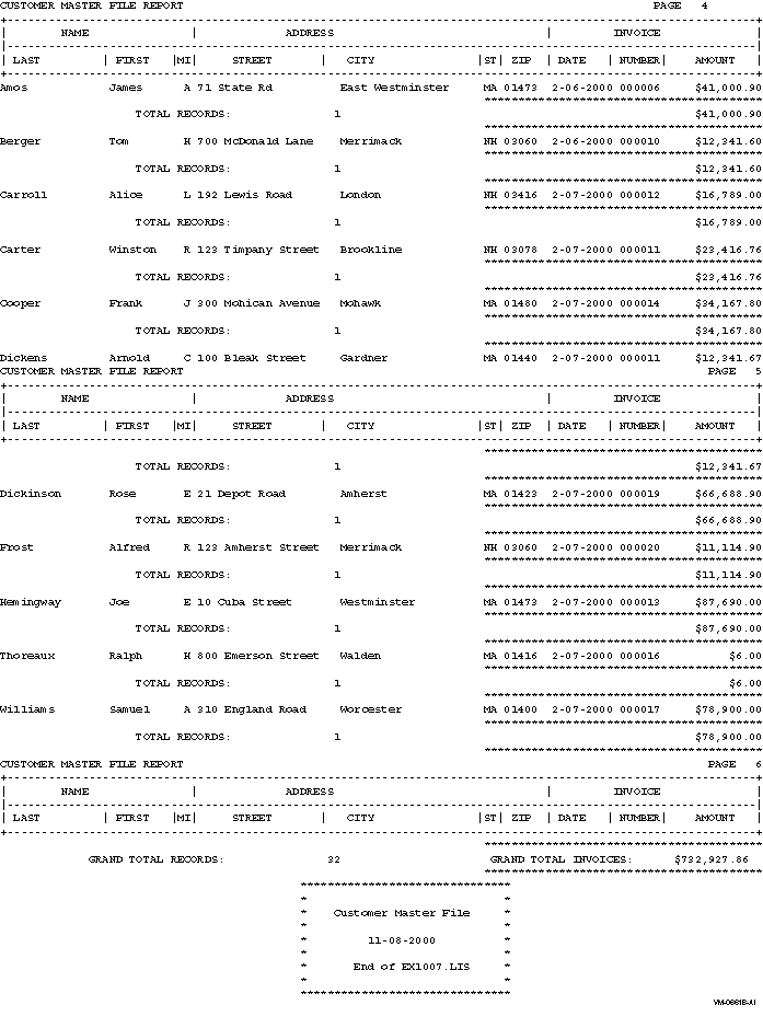 Example 10-7 (EX1007) is a Report Writer program that uses the REPORT HEADING, PAGE HEADING, DETAIL, CONTROL FOOTING, and REPORT FOOTING report groups and produces a detail report---EX1007.LIS (shown in Figure 10-16). The output includes both subtotals and rolling-forward totals.