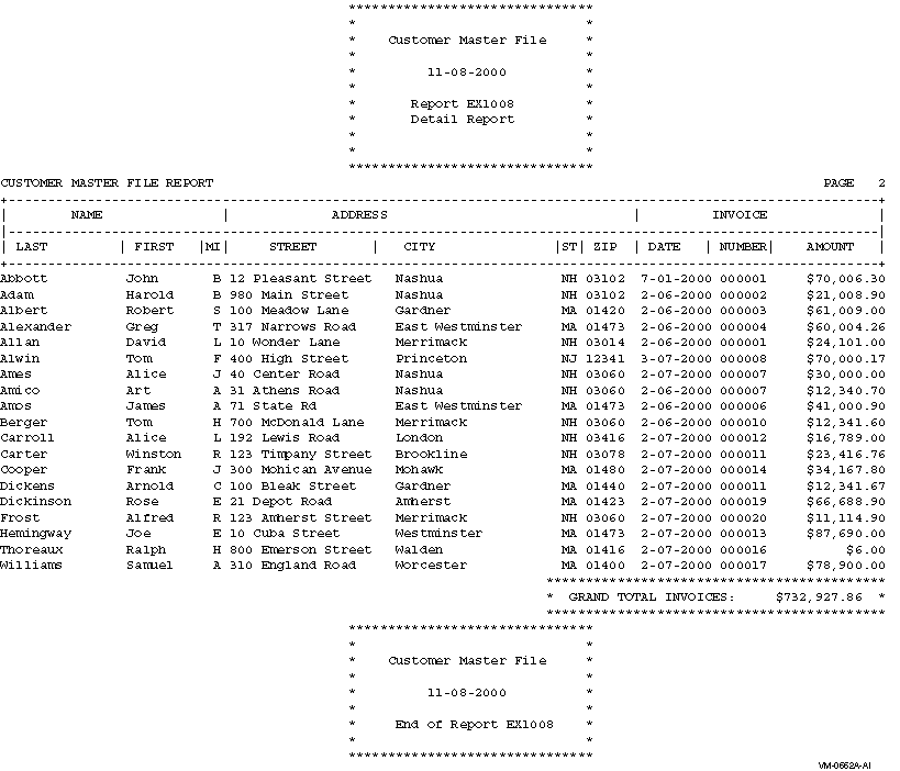 Example 10-8 (EX1008) is a Report Writer program that uses the REPORT HEADING, PAGE HEADING, DETAIL, CONTROL FOOTING, and REPORT FOOTING report groups and produces a detail report---EX1008.LIS (shown in Figure 10-17).