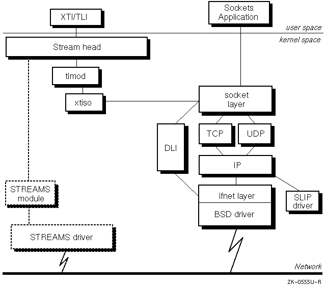 | Communication Bridges Between STREAMS and Sockets | ifnet STREAMS module | Allows STREAMS-based network device drivers to access the sockets-based TCP/IP protocol stack provided on Digital UNIX. See Chapter 7. |