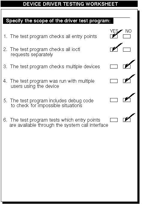 Figure 11-1 shows the device driver testing worksheet for the /dev/none device driver. To identify the scope of your driver test program, use the device driver testing worksheet in Appendix C.