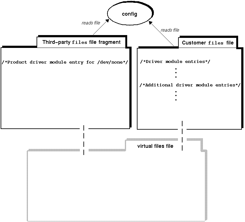 Figure 13-3 shows that the config program (which is called from the doconfig program) run by the customer reads both files files and makes the information specified in them available to the system. The figure also shows that config does not append the information in the supplied files file fragment to the customer's files file, but rather creates a virtual files file of the entries contained in both files. It does not alter the supplied third-party files file fragment or the customer's files file.