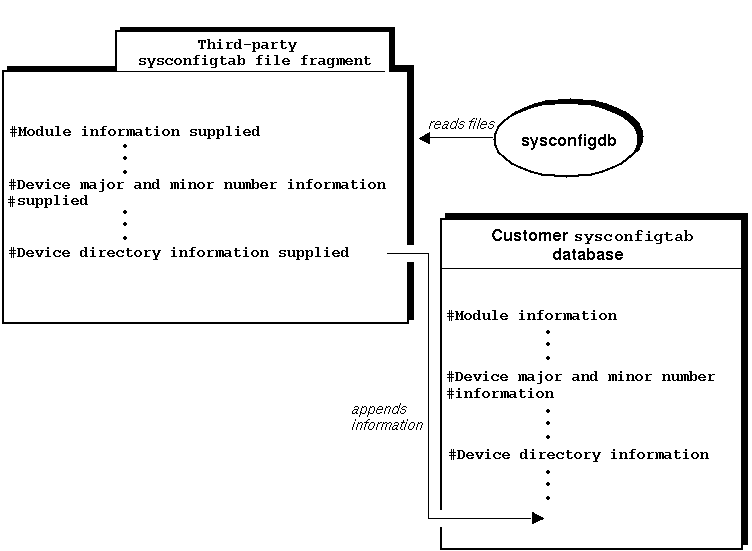 Furthermore, Figure 13-5 shows that the sysconfigdb utility appends the information contained in the sysconfigtab file fragment to the customer's /etc/sysconfigtab database.