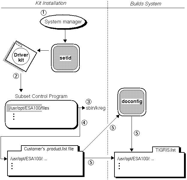 5. The doconfig program, run by the system manager, reads the .product.list file and copies it to a file of the form NAME.list. (This occurs only if the system manager (or the subset control program) does not specify the -c option. If the system manager (or the subset control program) specifies the -c option, the doconfig program builds a kernel based on the contents of the file specified by the system manager. In this case, doconfig does not perform the copy operation.) The NAME variable usually specifies the name of the target configuration file. For example, TIGRIS.list would be the name for the file that contains information about statically configured device drivers for the customer system described by the target configuration file called TIGRIS.