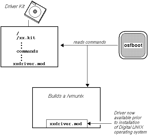 As the figure shows, the driver kit contains a name.kit file called xx.kit. The xx.kit file contains the commands that instruct the osfboot software on how to build and configure a /vmunix kernel to include the single binary module xxdriver.mod. The figure shows that upon completion of this /vmunix kernel, the xxdriver.mod single binary module (the executable driver) is available to handle user and system requests of a specific hardware device during the initial installation and boot of the Digital UNIX operating system.