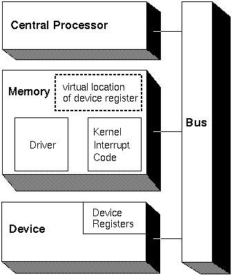Figure 16-1 shows that both the kernel and device drivers reside in memory, as does the kernel interrupt code that determines what driver will handle each interrupt from a device. The device driver accesses device registers (often referred to as control status register or CSR addresses) as though they were in memory; however, these registers are not really in memory but are located in the device. Figure 16-1 shows this arrangment by identifying a virtual location for the device registers. The hardware manual for the device you are writing the driver for should describe these device register addresses or offsets.