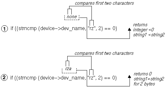 The code fragment sets up a condition statement that performs some tasks based on the results of the comparison. Figure 18-2 shows how strncmp compares two sample character string values in the code fragment. In item 1, strncmp compares the first two characters of the device name none with the string rz and returns an integer less than the value zero (0). The reason for this is that strncmp makes a lexicographical comparison between the two strings and the string no comes before the string rz. In item 2, strncmp compares the first two characters of the device name rza with the string rz and returns the value zero (0). The reason for this is that strncmp makes a lexicographical comparison between the two strings and the string rz is equal to the string rz. [Return to example]