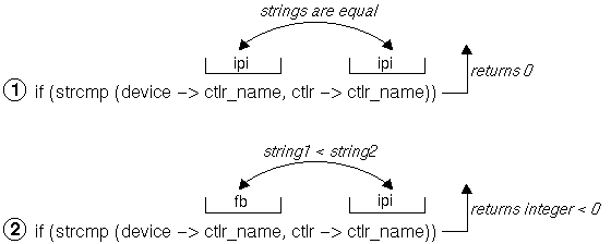 In item 2, strcmp returns an integer that is less than zero because the lexicographical comparison indicates that the characters in the first controller name, fb, come before the letters in the second controller name, ipi. [Return to example]