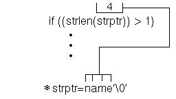 The code fragment sets up a condition statement that performs some tasks based on the length of the string. Figure 18-5 shows how strlen checks the number of characters in a sample string in the code fragment. As the figure shows, strlen returns the number of characters pointed to by the strptr variable, which in the code fragment is four. Note that strlen does not count the terminating null character. [Return to example]